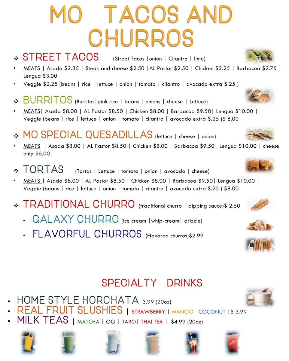 Right in the heart of Fayetteville at 329 N West Ave, the Mo’ Tacos And Churros Menu is the kind of lineup that makes deciding what to order feel like a delicious challenge. You’ll spot street-style tacos loaded with juicy meats, fresh toppings, and just the right kick of heat. From classic carne asada to flavorful chicken and slow-cooked pork, every bite feels thoughtfully stacked and generously portioned.